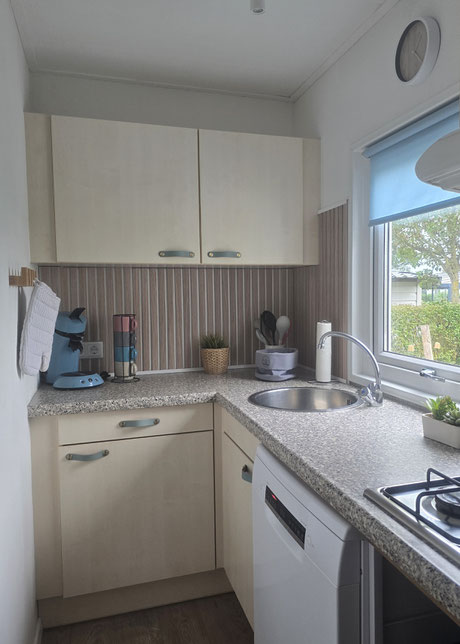 Eine Küche ist ausgestattet mit Kochfeld, Senseo-Kaffeemaschine, Toaster, Wasserkocher und Minibackofen, Kühl - Gefrierkombination, sowie einer Geschirrspülmaschine.
